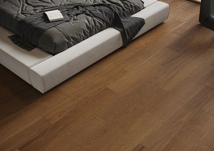 Krásná dubová podlaha v hlubokém hnědém odstínu vás uchvátí elegancí a svým výrazným stylem. Intenzivní barva zvýrazňuje přirozené letokruhy, čímž interiéru dodává ušlechtilost a výjimečnou hloubku.